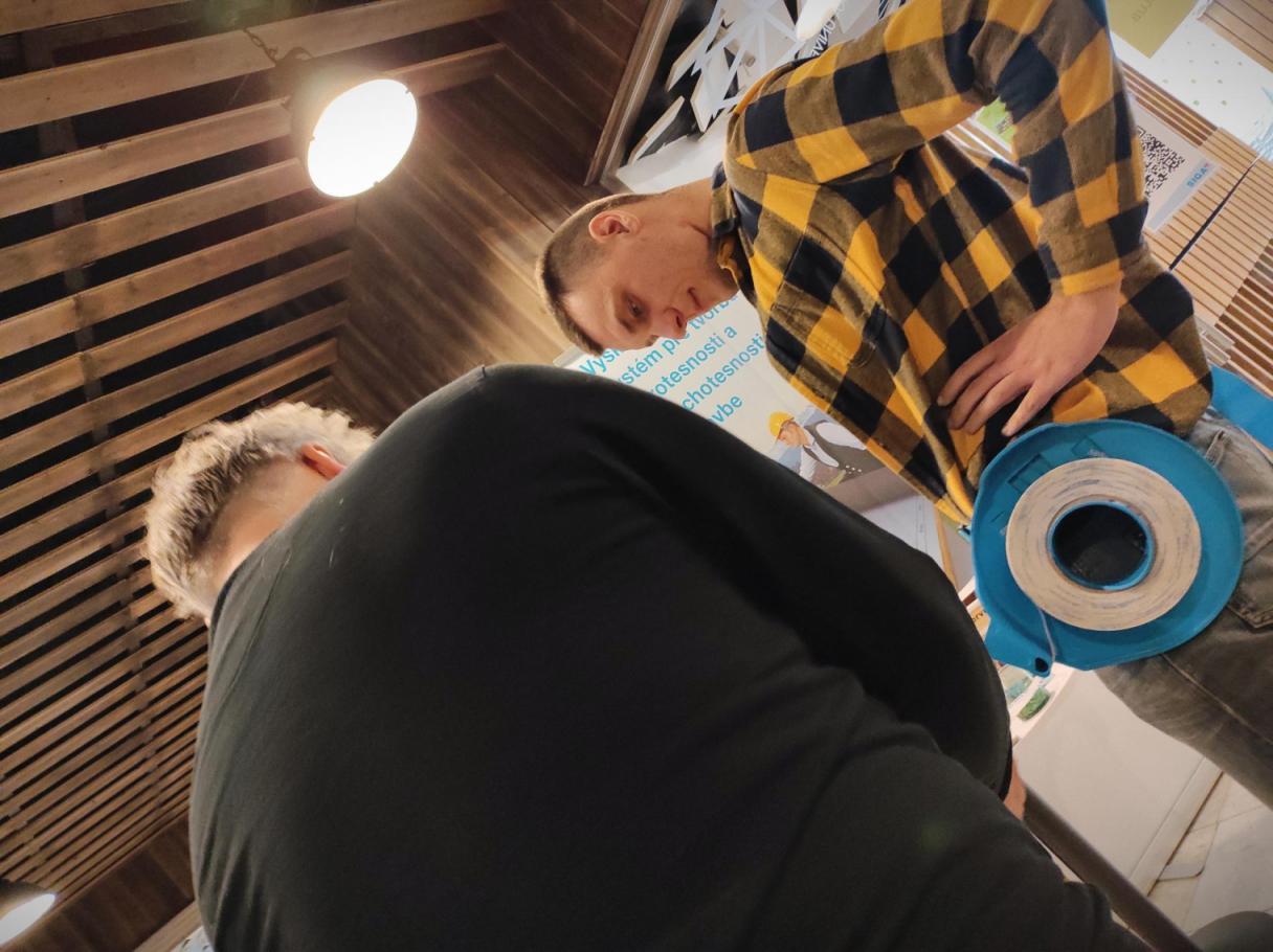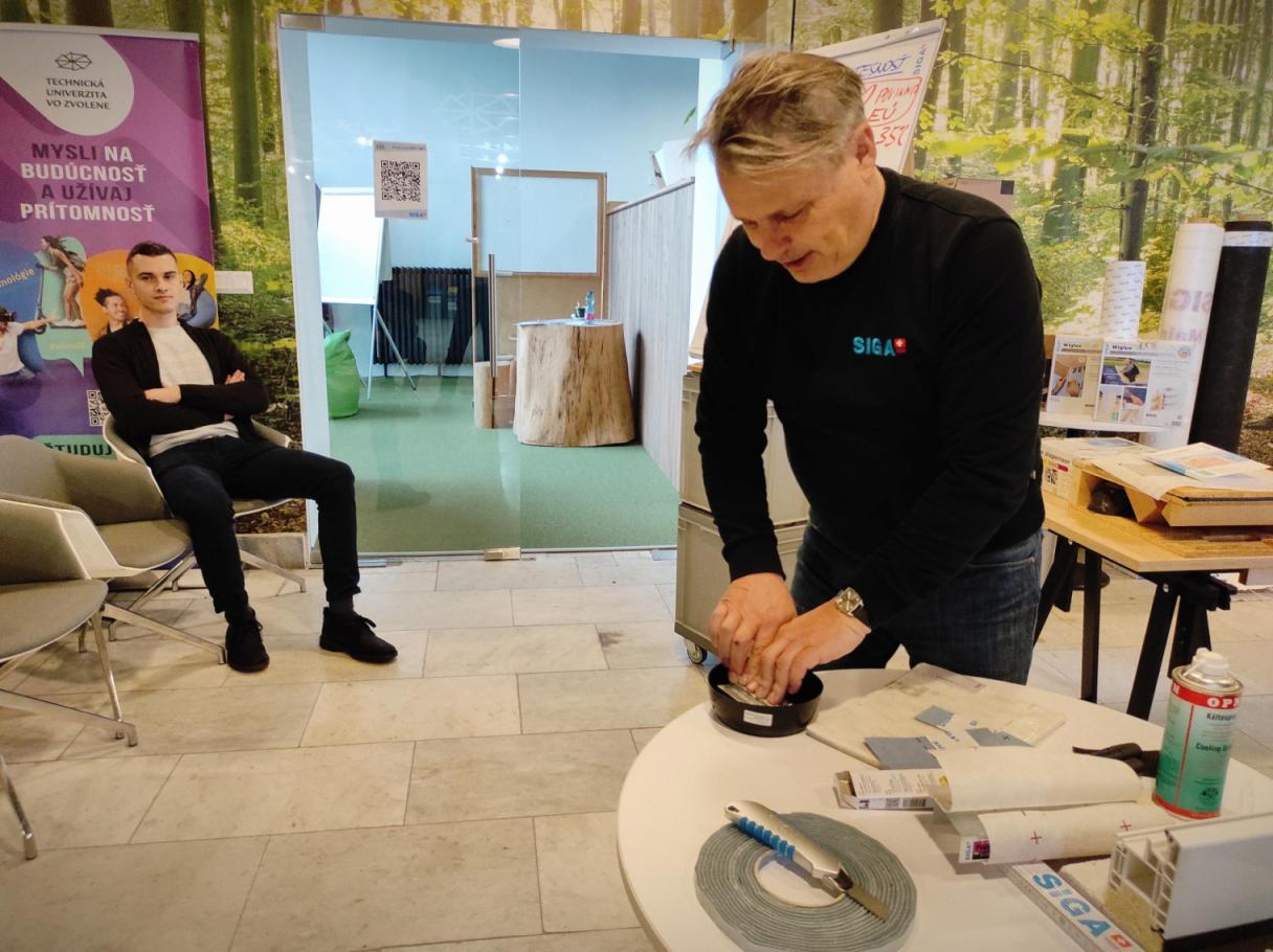 Po odbornej časti nasledovala praktická ukážka technológií, v rámci ktorej si študenti mohli na pripravených modeloch vyskúšať aplikáciu fólií, pások a ďalších komponentov SIGA. Táto aktivita im umožnila konfrontovať teoretické poznatky s reálnou prácou v teréne a zároveň porozumieť tomu, aké problémy môžu pri zhotovovaní vzduchotesných detailov vzniknúť a ako ich efektívne riešiť.